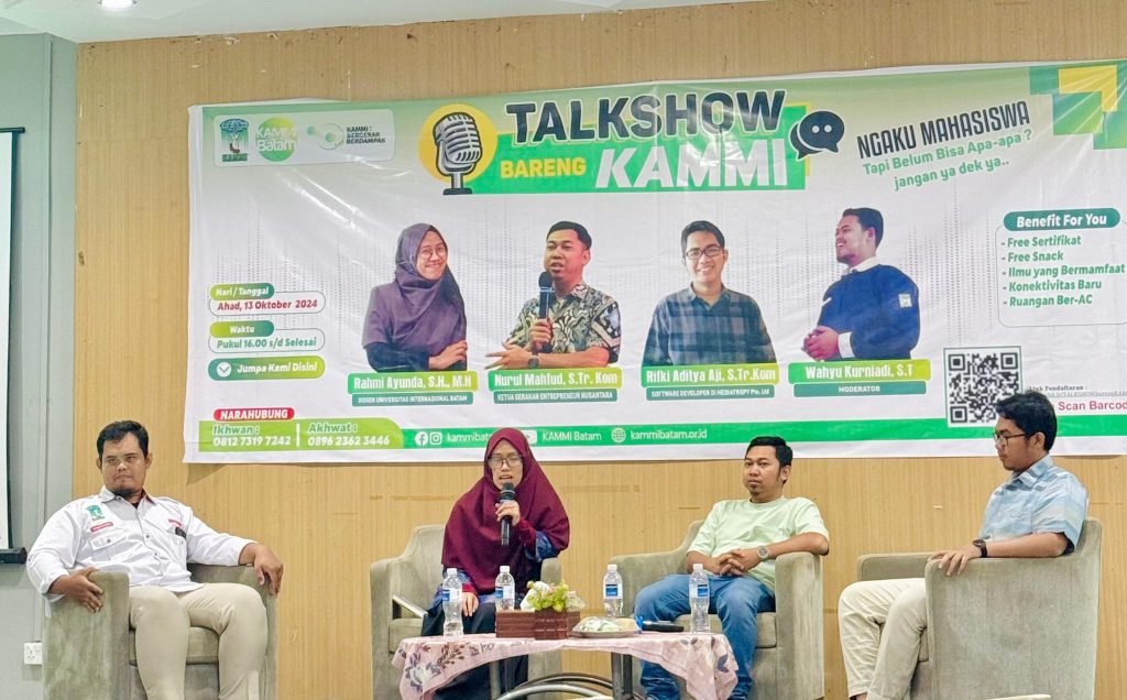 Talk show ini di moderator langsung oleh, ketua Pengurus Daerah KAMMI Kota Batam,Wahyu Kurniadi, S.T, dan menampilkan beberapa narasumber inspiratif, dari kalangan akademisi, pengusaha dan profesional, diantaranya Rahmi Ayunda,S.H.M.H (Dosen Universitas Internasional Batam Fakultas Hukum) dan Nurul Mahfud, S.Tr.Kom (Ketua Gerakan Intrepeneur Nusantara) dan Rifqi Aditya Aji, S.Tr.Kom (Software Developer Mediatropy Pte.Ltd).