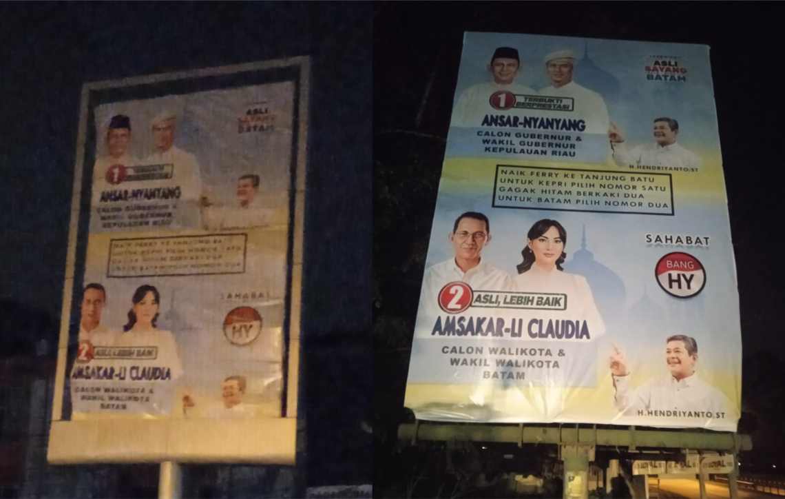 BATAMHEADLINE – Komitmen H. Hendriyanto, ST untuk mendukung Pasangan Calon ( Paslon) Gubernur dan Wakil Gubernur Kepulauan Riau ( Kepri) nomor urut 1, Ansar Ahmad dan Nyanyang Haris Pratamura diwujudkan dengan memasang pernyataan dirinya untuk dukungan Paslon tersebut di papan Billboard sejumlah titik simpang jalan di Kecamatan Batam Center dan Nongsa.