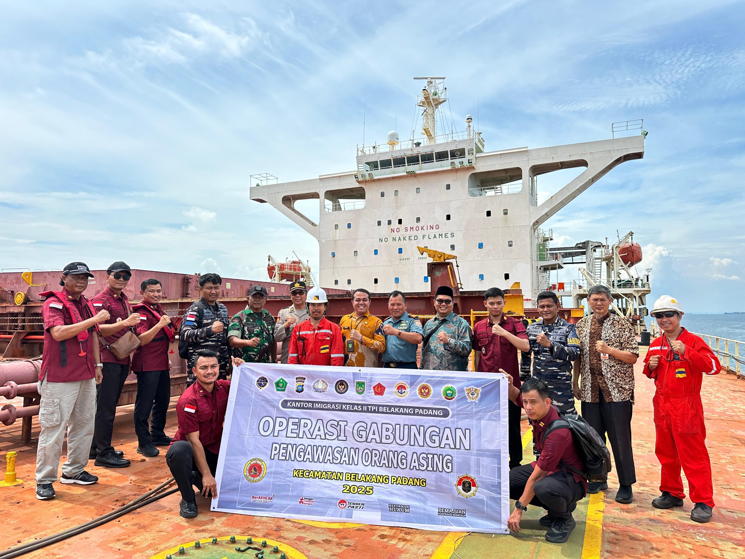 BATAMHEADLINE — Dalam rangka memperkuat pengawasan terhadap keberadaan dan aktivitas Warga Negara Asing (WNA) di wilayah perairan Indonesia, Tim Pengawasan Orang Asing (TIMPORA) Kantor Imigrasi Kelas II TPI Belakang Padang melaksanakan Operasi Gabungan dengan menyasar kapal asing MV. MANASOTA yang sedang berlabuh di sekitar Pulau Nipah, Kecamatan Belakang Padang, Kamis (24/4/2025).