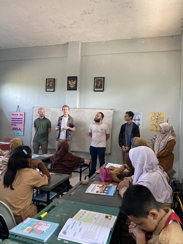 ang membuat hari itu istimewa, bukan hanya kehadiran para dosen Polibatam, tetapi juga tiga mahasiswa asing asal Prancis: Cyprien Guitton, Tomy Bolle, dan Axel Serrano. Ketiganya sedang mengikuti program magang di Polibatam, dan kini turun langsung menginspirasi siswa-siswa kecil untuk berbicara bahasa Inggris tanpa rasa takut.