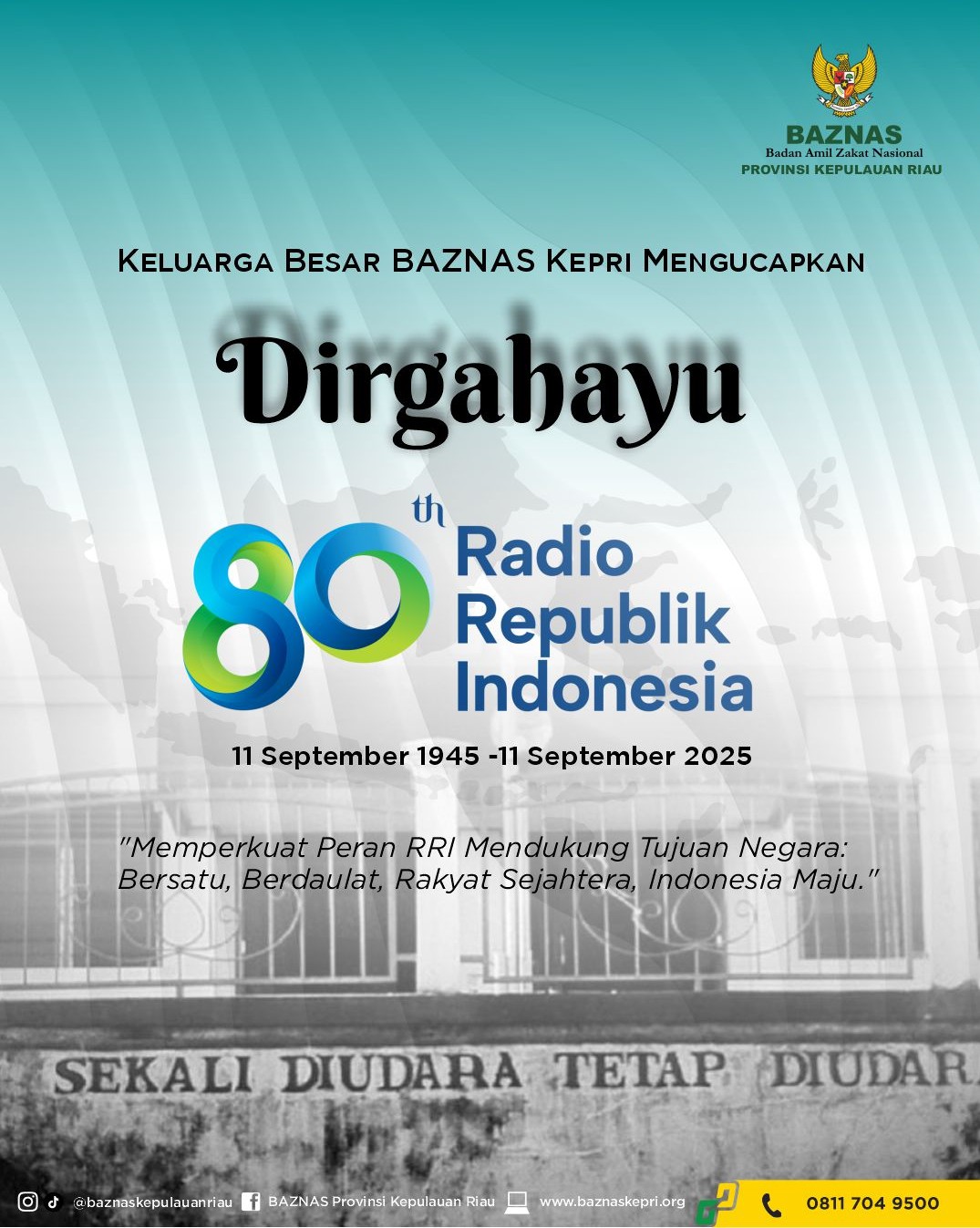 BATAMHEADLINE – Badan Amil Zakat Nasional (BAZNAS) Provinsi Kepulauan Riau menyampaikan apresiasi yang tinggi atas peringatan Hari Ulang Tahun ke-80 Radio Republik Indonesia (RRI). Momentum delapan dekade RRI mengudara menjadi simbol konsistensi dalam menyebarkan informasi, edukasi, serta dakwah yang membawa manfaat bagi seluruh rakyat Indonesia.