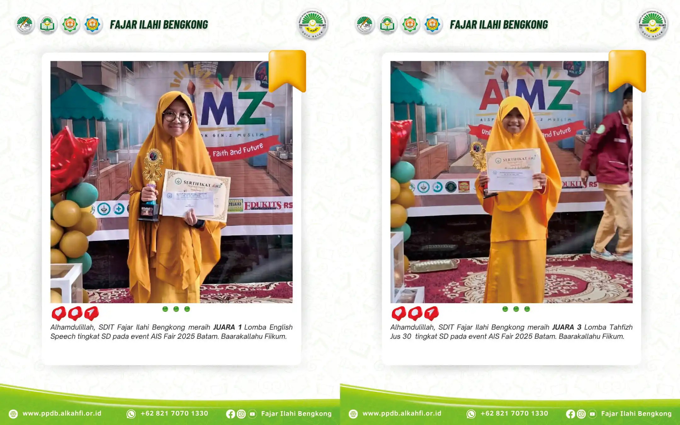 “Alhamdulillahi ladzi bini’matihi tatimussalihat. Tahniah kami ucapkan kepada Ananda Khansa Aya Sofya – Juara 1 lomba English Speech, dan Ananda Mufiidah Salsabila – Juara 3 lomba Tahfizh Juz 30 pada event AIS Fair 2025. Jazakumullahu Khairan kami ucapkan kepada kedua orang tua serta ustadzah pembimbing yang telah memberikan dukungan penuh kepada ananda,” tulis pihak sekolah.